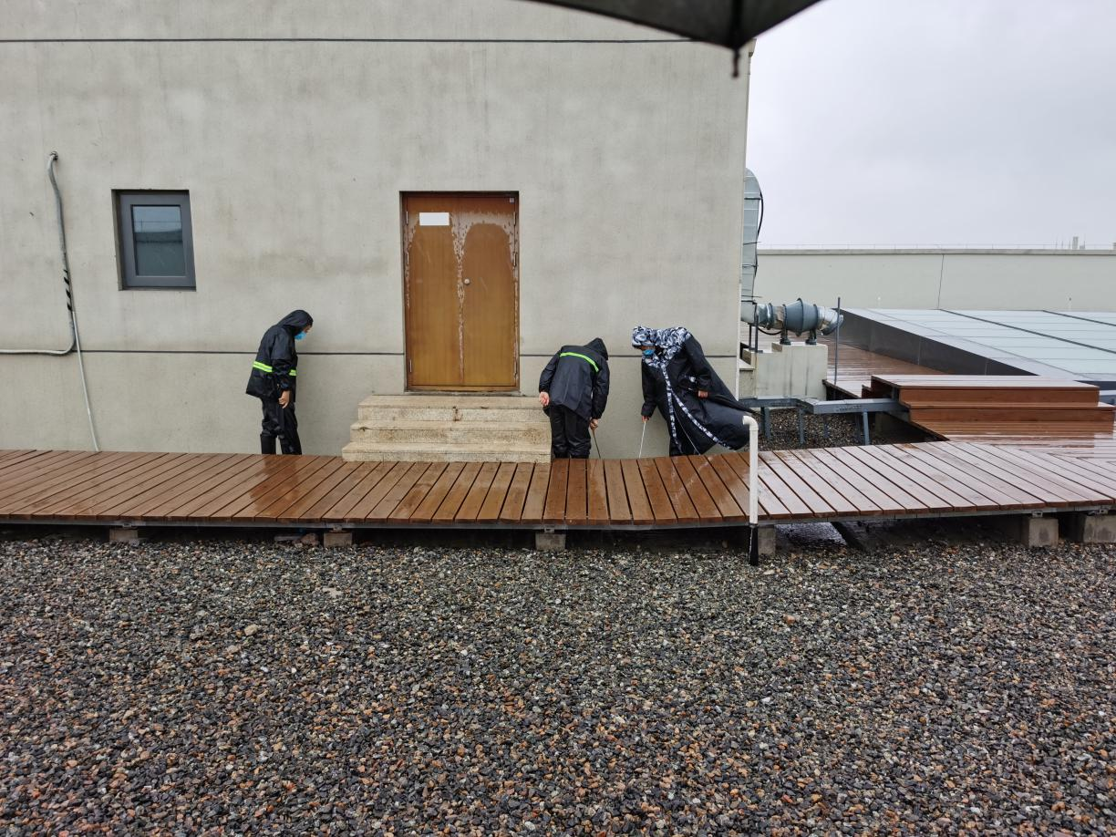二是在地下车库B1、B2出入口、餐厅下沉小院、北楼9层花园、地下电梯厅电梯入口等重点区域摆放挡水沙袋、安装挡水板,防止雨水倒灌。