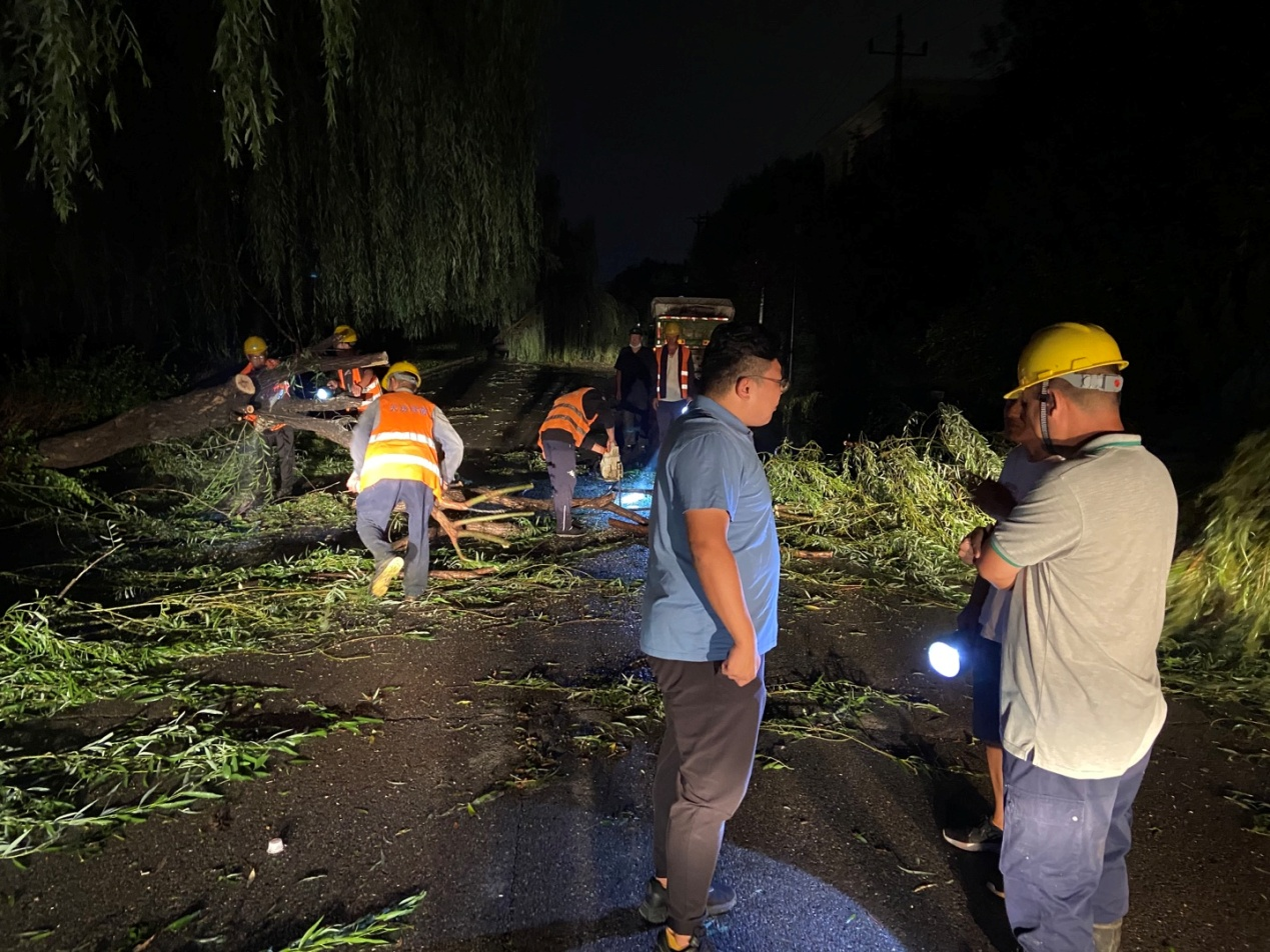 天房绿茵公司此次共出动13人进行防汛抢险工作,为了能够尽快恢复交通,大家在疾风骤雨中同心协办、全力以赴投入到抢险中,先后分解清理倒伏树木,对路面落枝落叶进行清理,仅用时二十几分钟就使得道路恢复了畅通。